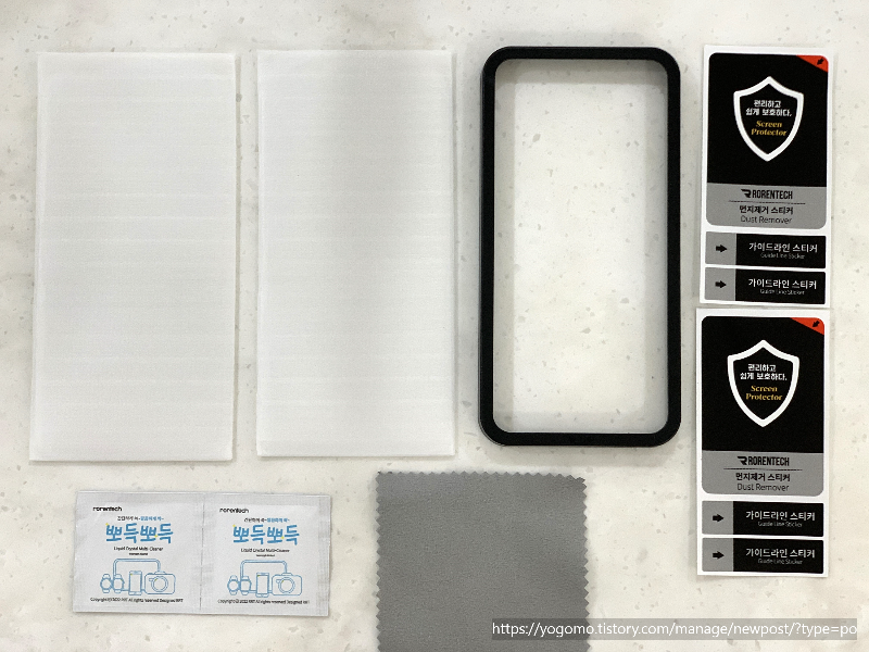 구성품은 필름 2장, 가이드, 알코올솜 2매, 먼지제거스티커 2매, 부드러운 천
